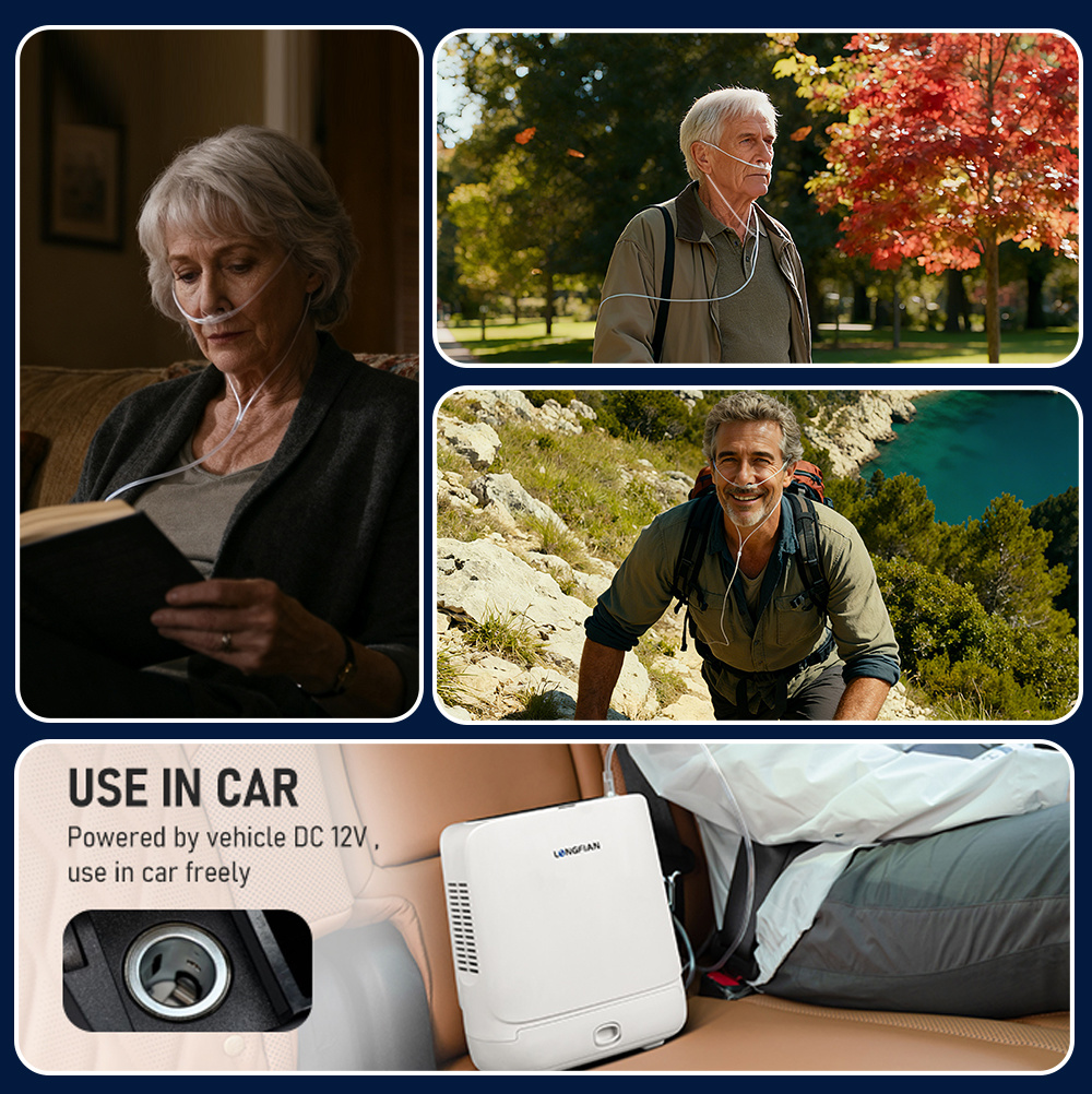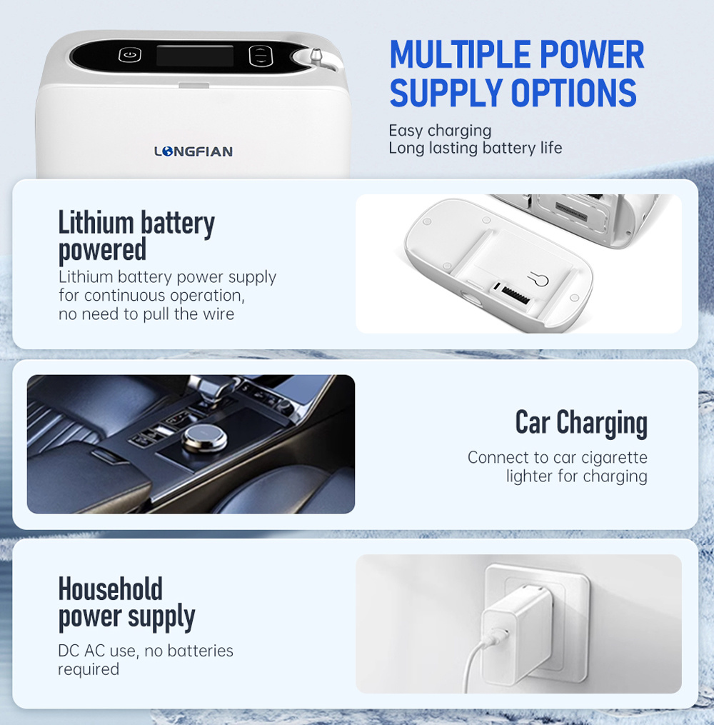 JAY-1000P supports multiple power sources to match your lifestyle. Plug it into a standard AC wall outlet at home, use the included car adapter while on the road,or rely on the removable lithium battery for hours of cordless use outdoors.Whether you're at home,in transit,or out and about, your oxygen supply stays uninterrupted.It also comes with a specially designed multifunctional carry bag that supports multiple wearing styles: carry it by hand, over the shoulder, or wear it as a backpack.This flexibility suits different mobility needs-from everyday errands to travel.